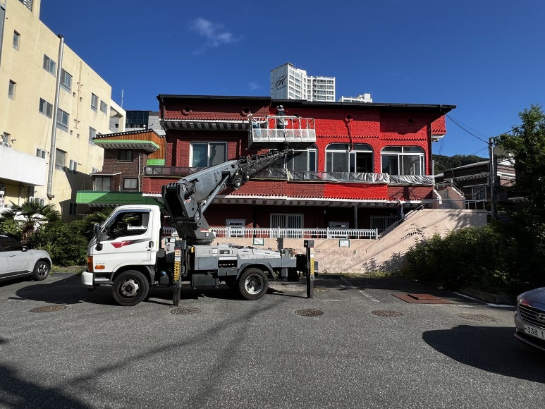 다행히 전면부는 옆 건물이 주차장으로 사용 중인 공간이라 장비 배치가 수월했습니다. 덕분에 작업 동선이 깔끔해졌고, 도장 품질에도 집중할 수 있었습니다. 이번에 선택한 컬러는 강렬하면서도 인상이 확실한 빨간색. 기존 외벽 분위기를 완전히 바꾸는 색감이라, 마감 후 전체적인 이미지가 또렷해졌습니다. 햇빛을 받았을 때의 색감도 살아 있어, 주택의 존재감이 확실히 드러났습니다.